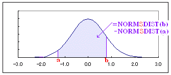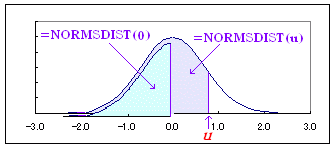 ○ 正規分布のような連続分布においては,変数 x が「ちょうどある値になる確率」という形で確率を考えるのではなく,a ≦ x ≦ b のように指定された区間にある確率を考える. たとえば,多人数の人の身長が正規分布をしているとき,抽出された1人の身長がちょうど x = 170.0000000・・・(cm)となる人はいないので,1人選んでx=170.00000・・となる確率を求めても 0 となって意味がなく,身長が 165 ≦ x ≦ 175 (cm) のように幅のある区間で考える. このような連続分布では,曲線の下にある図形の面積がその区間にある確率を表わす. ■Excelで計算するには 標準正規分布の確率を計算するには,関数 NORMSDIST(u) が使える. ただし,この関数は次図のような確率を表わしているので,数学で使う値に直すには,左半分を引いて, ![]()