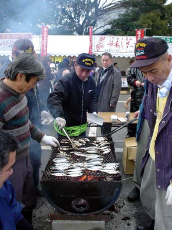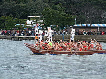 観覧席の文殊智恩寺駐車場にはたくさんの応援団の姿が、当日は会場に、特設テントで 冬の味覚フェアーが開催。あつあつ寒ブリ大根やいわしの浜焼き・ホカホカ甘酒の無料接待も有ります。 又、安価でうどん・たこ焼き・コーヒー屋台も出ているし、海産物格安コーナーでお土産に 松葉ガニ・あじ・いわし・干し物等多数用意してあります。毎年開催され今回平成15年で第20回を 数えています。開会式は10時半より文殊智恩寺駐車場にて開催、暖かい恰好をして応援よろしく。