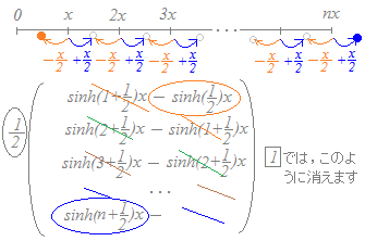 次の図のように,位相が+x/2と−x/2ずれたものの差で表すと,総和の中間項が消えることを利用します.