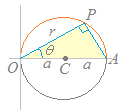 円周角の定理を思い出すと,直径の上に立つ円周角は90°になるから,直径2aにcosθを掛けた2acosθ=OPとなればPは円周上にある.したがって,この問題の結果は小学校以来学んでいる半円の長さπaになるはずであるが,これを極座標での曲線の長さの計算で確かめることになる. だから |