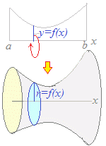 上の図のようにx軸のまわりに回転させたとき,x軸に垂直に切った断面は円になり,その半径はf(x)になります.