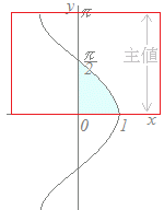 逆三角関数y=cos−1x ⇔ x=cos y は,右図のように −1≦x≦1, 0≦y≦π の区間で定義されます. この区間において,x軸およびy軸とで囲まれるのは,0≦y≦の部分です. V=π x2 dy←yで積分 =π cos2y dy =π dy =π + =π{(0+)−(0+0)}= → 5 |