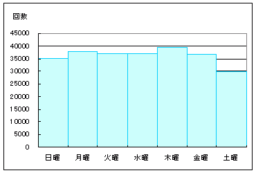 -- 平日の授業時間帯にアクセスが多ければ、授業で使用されている可能性が高いと推定できますが・・右図上はこの期間の曜日別アクセス数で、木曜日、月曜日がやや多いことが分かります。土曜日は少ないのですが格段に少ないわけでなく、日曜日は意外に多いことが分かります。