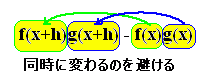 ■図(緑)の経路を考えると, ={ f(x+h)-f(x)} g(x+h)+f(x) { g(x+h)-g(x)} y=f(x)g(x)について ここで だから,次の公式が得られます. ■青の経路から行けば,分子は =f(x+h){ g(x+h)-g(x) } + { f(x+h)-f(x) } g(x) ■3つ以上の関数の積になっているときは,2つのときの公式を繰り返し適用すればできます。