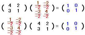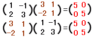 ○ n×n行列については逆行列の有無を考えることができます.正方行列でなければ逆行列を考える余地はありません.○ 一般にn×n行列 A に,右から掛けても左から掛けてもn次の単位行列となるn×n行列 B を A の逆行列といい,A- 1 で表わす.( AB=En ならば BA=En が成り立つので,右のように AB=En が成り立てばB は A の逆行列といえる.) |