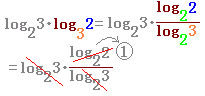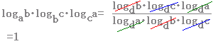 例題 次の式を簡単にしなさい。 (1) logab・logbc 答案 底をaにそろえる場合 (2) logab・logbc・logca 答案 底を第4の文字dにそろえる場合 ![]() |