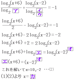 (4) (log2x)2−log2x3−10 =0 真数条件 x>0,x3>0 より log2x=A とおくと (A は正でも負でも可能!!) A2− (A-5)(A+2)=0 A=5,−2 log2x=5,−2より |