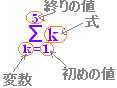 ○ 和を表わす記号Σでは,次のように「式」の形のところの「変数で指定されたものを」「初めの値」から「終りの値まで」「1ずつ増やして」できる項の「和」を表わす. ![]() |
