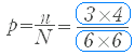 A , B が独立であるとき,A も B も起こる確率は 例1 さいころを2回投げて1回目に3以下,2回目に4以下の目が出る確率を求めるとき ここまでに習った考え方で,右の図1のように1回目,2回目の起こり得るすべての場合を N=36 と考えるときは,⇒ このように,A , B が独立であるとき,A も B も起こる確率は |