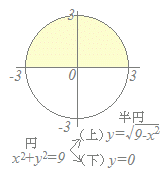 図形上は,(上):x+も(下):x−も と−から同じ分量xだけ持ち上げているので,面積は元の円と等しいということになります. |