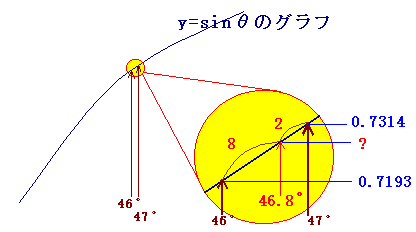 y=sinθのグラフは大きく見れば曲線ですが,46゜と47゜の間のような小さな区間では「直線とみなしても」ほとんど誤差がありません.そこで,sin46.8゜の値を,sin46゜とsin47゜の値(