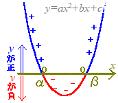 ax2+bx+c=0の解がx=α, β (α<β)のとき 問題がax2+bx+c<0 (a>0)なら,