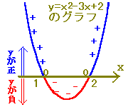 x2−3x+2が0以下になる(≦)ようなxの値の範囲をさがします.⇒ マイナスは「間」 (=付き) |