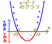 x2−4が0以上になる(≧)ようなxの値の範囲をさがします.⇒ プラスは「両側」 (等号付き) |