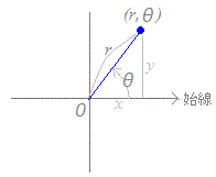 ※極座標としては通常r≧0のものを扱いますが,必要に応じてr<0となる表現も使われることがあります.r<0のときは,半径が正で偏角がθ+πの点を表すものとします.平面上の点を,原点からの距離rと始線(x軸の正の向き)からの偏角θの組(r, θ)で表したものを極座標といいます. ![]() ※中学校で習った直交座標(x,y)と極座標(r, θ)(ただし,r≧0とする.)とは,次の関係があります. [極座標→直交座標]