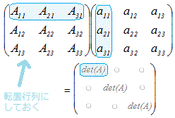 行列Aの余因子を並べた行列の転置行列を作ると行列Aとの積が,上記のような余因子展開に対応する