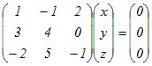 とするとx=y=z=0以外の解となる.y=t z=−t (t≠0) たとえば (x, y, z)=(1, 1, −1)はこれを満たす. |