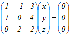 (2)よりy=(x) …(2’) …y , zをxで表す(xについては解かない)ことにして,解かないことを忘れないようにカッコに入れる−x+y=0 …(2) −2x+5y+3z=0 …(3) これを(1)(3)に代入