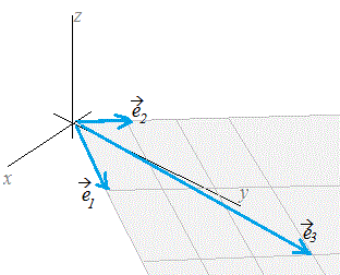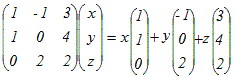 ![]() , , という3つのベクトルの1次結合はxyz空間のすべてのベクトルを表すことができる.これらのベクトルは1次独立で3次元空間の基底になっている.