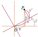 右図2のように,旧座標が(x, y)である点を動かさずに,座標系を原点の回りに角θだけ回転させたとき,新座標が(x', y' )になるとき,新座標を旧座標で表すときにもこの形の行列が使われる.