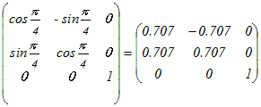 z軸のまわりに角π/4(45°)だけ回転させる1次変換の行列は