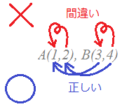 直角三角形において斜辺の長さをc,直角と隣り合う2辺の長さをa, bとするとき ![]() →参考 a=cのときやb=dのときは,三角形が「つぶれて」縦線または横線になりますが,この場合でも公式(1)は成り立ちます. ![]() AB=4−1=3 公式からは AB===3 となって,結果は一致します. さらに,a=cかつb=dのときは,三角形が完全に「つぶれて」1点になりますが,この場合でも公式(1)は成り立ちます. AA===0 ≪よくある間違い≫• 引き算はx座標同士,y座標同士で行わなければなりません. 例えば,2点A(1, 2), B(3, 4)間の距離を求めたいとき, ← × ← ○ • 座標がマイナスのときに引き算の符号を間違う生徒が多い. 例えば,2点C(−5, 6), D(7, 8)間の距離を求めたいとき, ← × ← ○ |