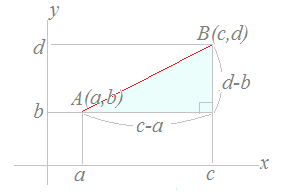 (1)←右の直角三角形において,横の長さは c−a,縦の長さは d−bだから, 三平方の定理(*)を使うと斜辺の長さを求めることができます. AB2=(c−a)2+(d−b)2 AB=