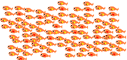 図1のように,もとの集団(ここでは胸ビレを黄色で表示しています)のいる所に標識を付けた集団(胸ビレを赤色で表示しています)を放流します.数か月経つと図2のように混ざり合って生活します.そこで,一定数回収します(図3).