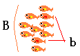 例 標識を付けた魚を100匹放流し(a=100),数か月後に魚を100匹回収した(B=100)とき,その内10匹に標識が付いていた(b=10)とすれば,