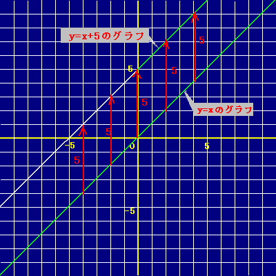 このようなグラフは「1次関数のグラフ」と呼ばれ,右図のように y=x のグラフを上に5だけ平行移動したものです。