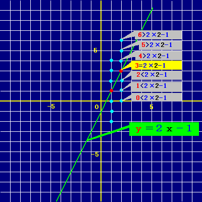 y=2x−1の直線上にある点(2,3)では3と2×2−1が等しくなっています。(3=2×2−1が成立。)