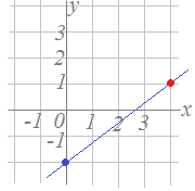 例10右のような直線の方程式を読み取りたいとき, ○ 青の点のy座標から切片は−2です. ○ 次に,傾きを求めるときに,xが1だけ増加したときのyの増加を読み取ろうとすると,分数(小数)になってしまって正確に読み取れません. そこで,右に進んでx座標,y座標の両方とも整数であるような点を探すと,赤で示した点まで右に4,上に3進めばよいことが分かります. 傾きはになります. ○ これらを組み合わせると,直線の方程式が求まります. 直線の方程式 : y=x−2