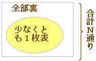 少なくとも1枚表が出る場合がn通り,全部裏となる場合がm通り,全部でn+m=N通りとすると,n=N−m