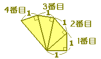 1番目の三角形として直角をはさむ2辺の長さが1,1である直角三角形を作ります. 次に,その斜辺と長さ1の辺を直角をはさむ2辺として,2番目の三角形を作ります. さらに,できた斜辺と長さ1の辺を直角をはさむ2辺として,3番目の三角形を作ります. 同様にして,4番目の三角形を作ったとき,4番目の三角形の斜辺の長さを求めなさい. ![]() 2 Help 解説 やり直す