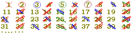 例えば,1を素因数分解に含めない普通の立場では6の素因数分解は2×3のただ1通りに決まりますが,1を素因数に含めてしまうと1×2×3, 12×2×3, 13×2×3, 14×2×3, ...と素因数分解の仕方が何通りでもあることになり混乱が起こります. その方法は, 1は素数とはしないので除外する.(意外と忘れやすいので注意.中学生では,約束だと思えばよい.) 2を残して2で割り切れるものを除外する.3を残して3で割り切れるものを除外する. (4は除外されている.) 5を残して5で割り切れるものを除外する. (6は除外されている.) 7を残して7で割り切れるものを除外する.... のように進めていき,残った数が素数と考えます. ![]() |