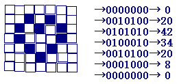 20世紀の後半以後,コンピュータの発展は社会生活の様々な分野に影響を及ぼすようになってきました.コンピュータでは,電気が流れる(1),電気が流れない(0)の2つを組合せて様々な処理を行っています.この0と1だけからなる信号は二進法に対応しています. 例えば,次のような「絵」も,■を1,□を0として, ![]() このように,コンピュータが社会生活に深く浸透する中で,計算だけでなく,絵,写真,さらに話し言葉の送受信にも二進法が使われるようになっています.二進法を理解することによってデジタル情報の基本が理解できます.