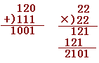 101(2) は 1×22+0×2+1 (=4+1= 5) です. 1111(2)は 1×23+1×22+1×2+1(=8+4+2+1= 15)です. (二進法では各位の数が1,2,4,8,16,32,..を何倍するかを表わしています. 実際には0(ない)と1(ある)だけです.)
