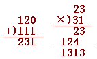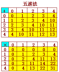 次の表は,三進法や五進法での足し算,掛け算の例です.