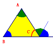 ∠Cの外角はBCを延長してAC側にできるものと,ACを延長してBC側にできるものの2つあります.これら2つの外角はいずれも