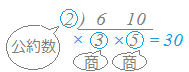 小学校で習う方法では,次のように割り算の裏向きのような書き方で共通に割れる数(2)で割って商(3, 5)を下に書く。 ![]() 公約数と各々の商を掛けたものが最小公倍数 2×3×5=30…(答)