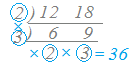 ![]() 公約数と各々の商を掛けたものが最小公倍数 2×3×2×3=36…(答) |