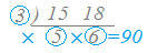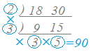 共通に割れる数は3だから,右図のように計算します.公約数と各々の商を掛けたものが最小公倍数 3×5×6=90…(答)