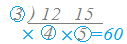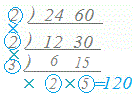 2で割っても,さらにまだ共通に割れる数があるので右のように計算します.(初めから12で割ることを思いついた場合は,1回の割り算でできます.)公約数と各々の商を掛けたものが最小公倍数 2×2×3×2×5=120…(答) |
