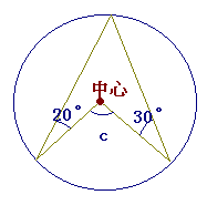 円の中心を通る直線で黄色で示した三角形を2つに分けると,それぞれが二等辺三角形になります.(半径が等しいから)そうすると,上端の角が20°+30°=50°になります. 次に,中心角は円周角の2倍だから,c=100° |