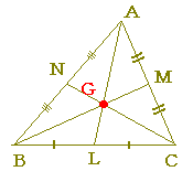 「△ABCの各頂点から対辺の中点に引いた線(中線)は,1点で交わります.」・・・ア□ 重心の性質 △ABCの重心をG,BC,CA,ABの中点を各々L,M,Nとするとき, |