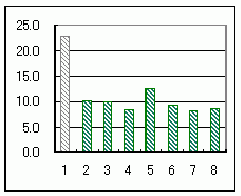 グラフ2は横軸が問題番号,縦軸は直前の操作以降その問題の採点までの経過時間(秒)を表わす.ただし,第1問は初めからの時間.