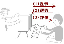 次の図は,生徒が(先生の代わりに)パソコンから情報を取り入れている様子を図示したものです.インターネットを利用した情報収集においては、図の(1)のみで学習が成り立ちます.また,シミュレーション(コンピュータ模擬実験)のような場合にも図の(1)に示した一方向の情報伝達のみで学習が成り立ちます. ![]() ホームページでこの条件を満たすためには,生徒の解答(2)−−入力は,マウスやキーボードから行われるのが普通−−が正しいか間違っているかに応じて「分岐する」ことが最低条件となります.分岐をHTMLのリンクだけで実現するには,次のような形が考えられます. (ただし,ア にはanswer1-1.htmへの,イ にはanswer1-2.htmへのリンクがかけられているものとします.) -----question1.htm------------------------------ (1) 問題:「現在の日本の首都はどこですか.」 ア 京都 イ 東京 -----answer1-1.htm------------------------------ 住めば都といっても,首都とは