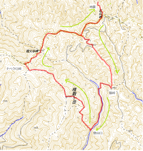 【桟敷ヶ岳登山口-直上コース-桟敷ヶ岳-ナベクロ峠-石仏峠-石仏−狼峠−登山口】
