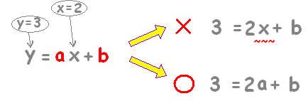 x,yに座標を代入するとa,bが残る。x,yは残らない。