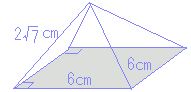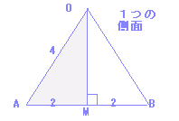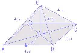 ■ 三平方の定理、立体の体積・表面積 [解説] ■ 右図のような立体の体積・表面積は,四角錐の高さなどを三平方の定理で求めてから計算します。 ■ 右図は底面が1辺の長さ4cmの正方形,側面が1辺の長さ4cmの正三角形です。 □ 体積を求めるには底面積×高さ÷3の公式を使いますが,そのためには高さOHを先に計算しておく必要があります。